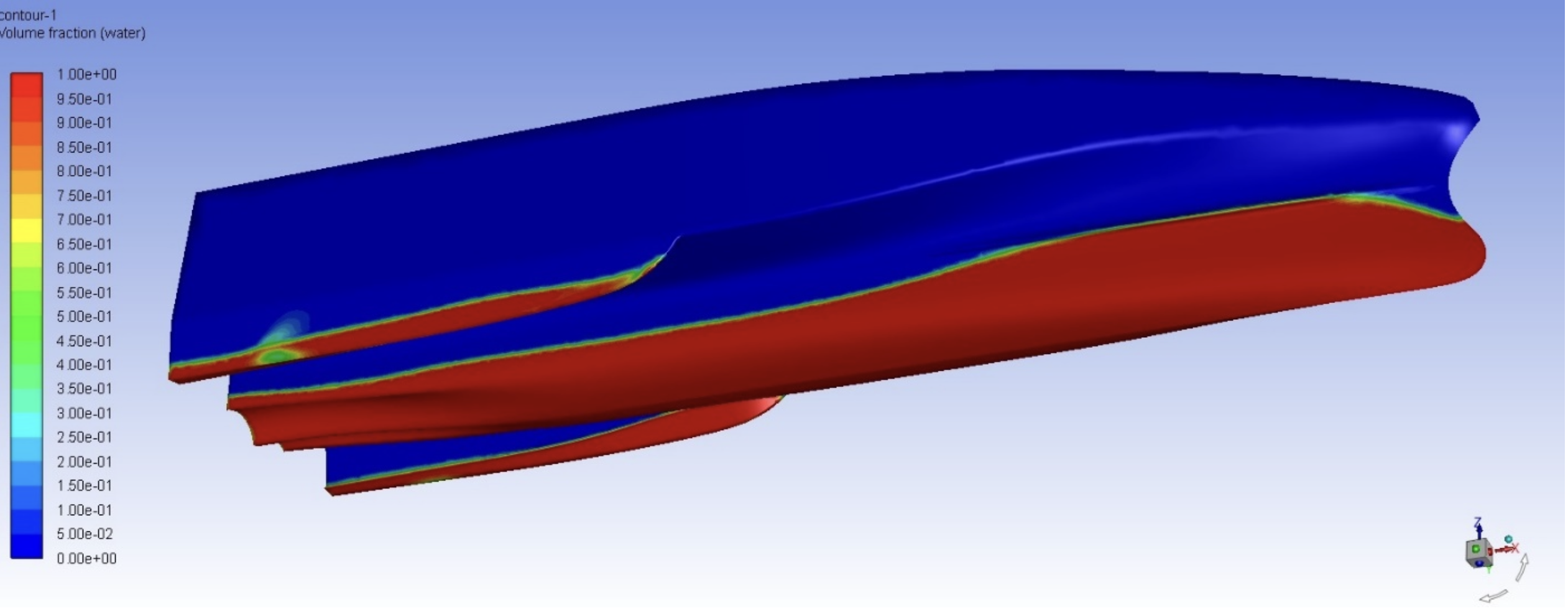 With ventilation and bow wave issues addressed, focus shifted to side hull submergence. A full model based on Variant 2 was created, extending the side hulls below the water surface depression. Analysis confirmed proper submergence and improved transverse stability.
