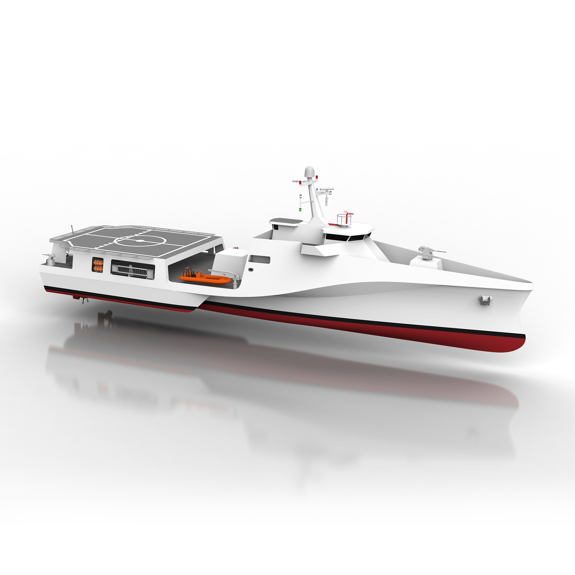 KM TRIPV700 is a trimaran OPV designed for superior seakeeping performance for increased operability. It facilitates a wider, larger and safer flight deck area for a 10-ton helicopter. The combined capabilities of the KM-TRIPV700 and the 10-ton helicopter provide increased SAR mission operability in high sea states. The Ship’s wide weatherdeck also provides an ideal area for configuring a variety of RHIB and USV arrangements.